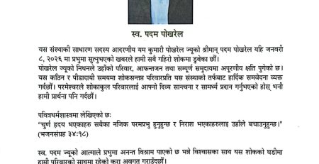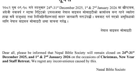Dear all, please be informed that Nepal Bible Society’s phone numbers 01-5190123 & 01-5190147 is currently under maintenance. Meanwhile, you... read more